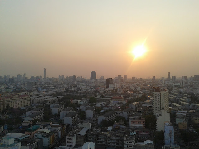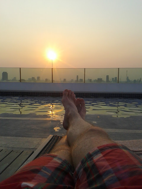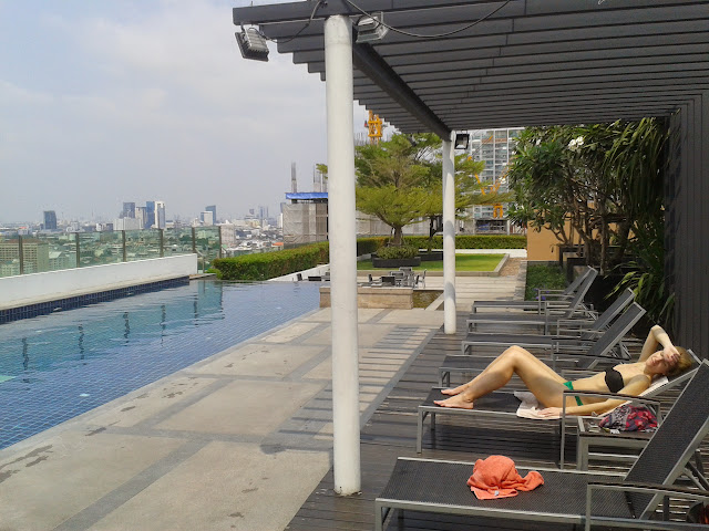 Prilet do Bangkoku probehl v naprostem poradku a to hlavne diky dokonale Ferdikove priprave. Lehce jsme nasli cestu z letiste, metro i apartman. Jeste nez jsme se ubytovali, jsme se sli na hodinu vyvalit na slunicko ke stresnimu bazenu (horizont pool) a kochali se vyhledem na mesto.