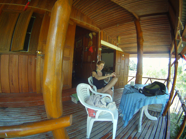 Mame tradicni thajsky domek 50m od more na zapadni casti ostrova Koh Phangan, coz ma tu vyhodu, ze kazdy vecer koukame na krasny zapad slunce. Vidime ho i pres zavrena okna i dvere, pripadne vidime co se deje pod barackem na zemi, z koupelny je zase skrz strechu videt nebe :D takhle dokonale utesneny je nas bejvak ;) Zije tu s nami jesterci rodinka a pravdepodobne i dalsi tvorove, ktere jsme jeste nevideli, ale slyseli. Hlida nas tu taky smecka asi 7 psu, patri mistimu nacelnikovi – asi 80lety Thajec, od ktereho mame pujceny skutr.